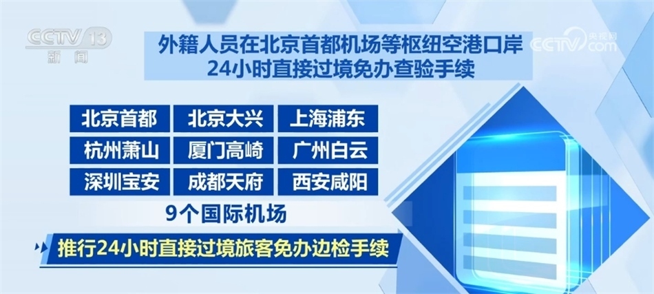 外籍人員在北京首都機(jī)場(chǎng)等樞紐空港口岸24小時(shí)直接過(guò)境免辦查驗(yàn)手續(xù)。在北京首都、北京大興、上海浦東、杭州蕭山、廈門(mén)高崎、廣州白云、深圳寶安、成都天府、西安咸陽(yáng)9個(gè)國(guó)際機(jī)場(chǎng),推行24小時(shí)直接過(guò)境旅客免辦邊檢手續(xù)。對(duì)于持24小時(shí)內(nèi)國(guó)際聯(lián)程機(jī)票,經(jīng)上述任一機(jī)場(chǎng)過(guò)境前往第三國(guó)或地區(qū)的出入境旅客,可以免辦邊檢手續(xù),直接免簽過(guò)境。