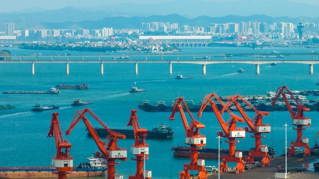 1月3日,在廣西梧州臨港經(jīng)濟區(qū)赤水港碼頭,工人操作設備在碼頭上進行裝卸作業(yè)(無人機照片)。新華社發(fā)(何華文攝)