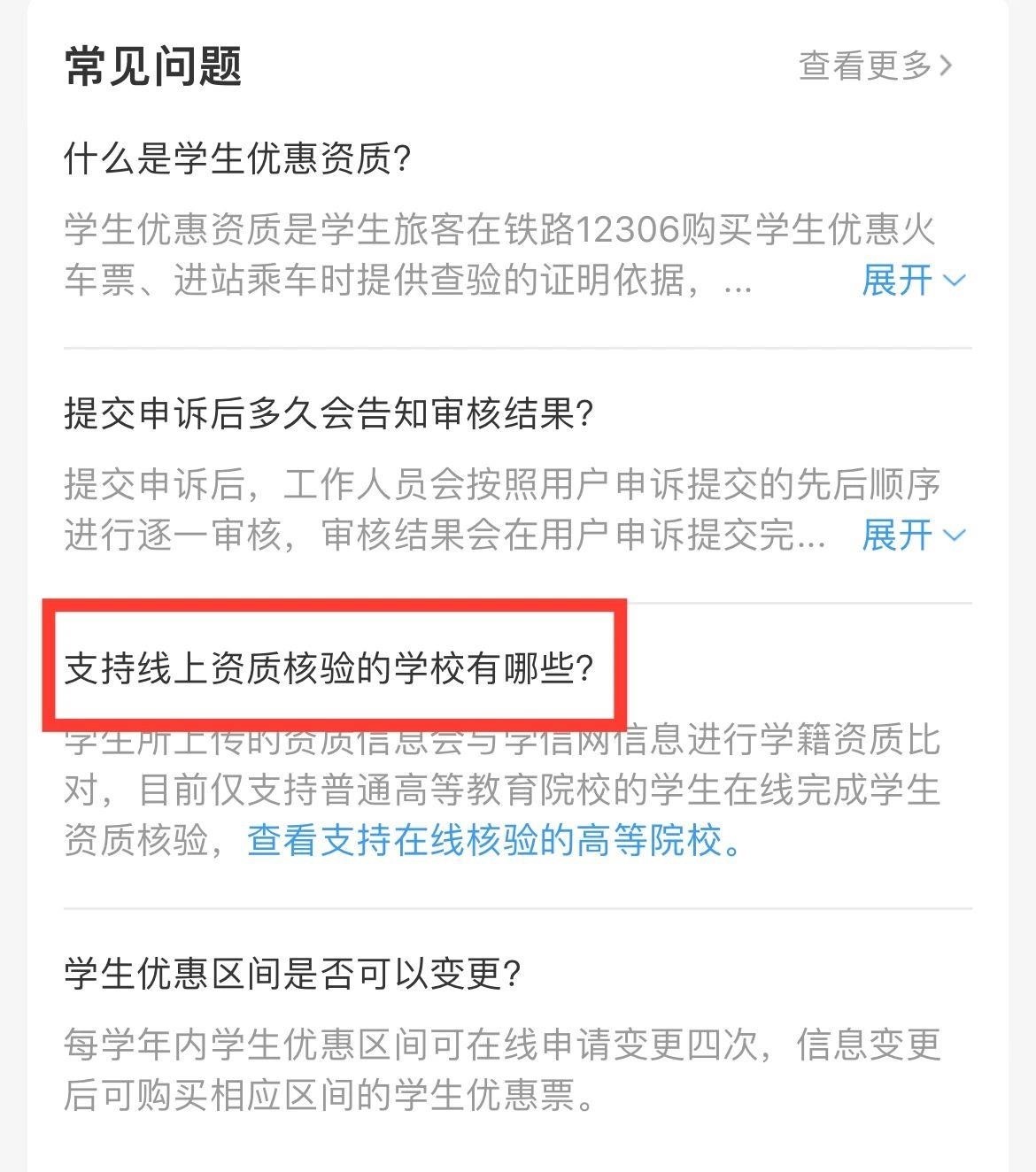 打開(kāi)鐵路12306App,右下角進(jìn)入“我的”頁(yè)面,在學(xué)生資質(zhì)填寫(xiě)頁(yè)面的“常見(jiàn)問(wèn)題”中,找到“支持線(xiàn)上資質(zhì)核驗(yàn)的學(xué)校有哪些?”即可查看支持在線(xiàn)核驗(yàn)的學(xué)校名單。