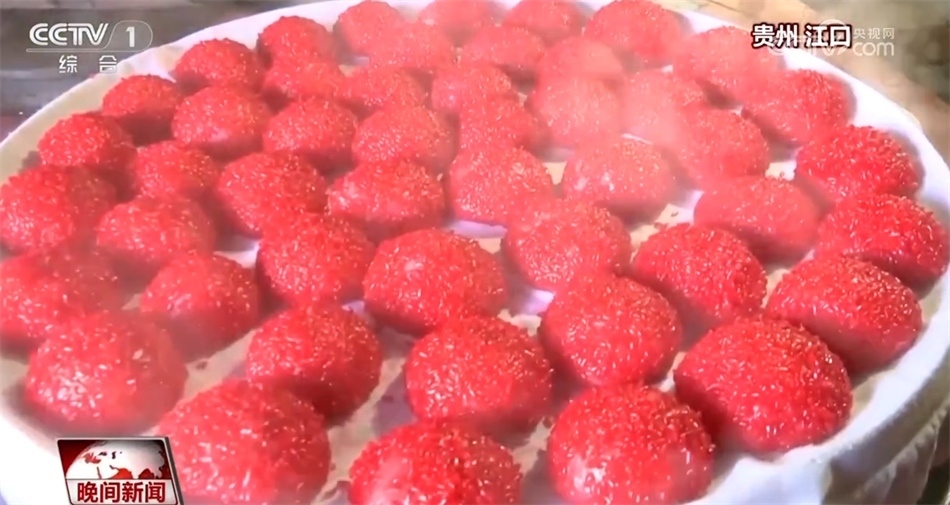 年貨寄托了人們對來年的美好期盼。貴州銅仁江口縣的“紅粑粑”寓意幸福美滿,每年春節(jié)前,當(dāng)?shù)厝硕紩R聚一堂,制作圓圓的“紅粑粑”等待過年的到來。