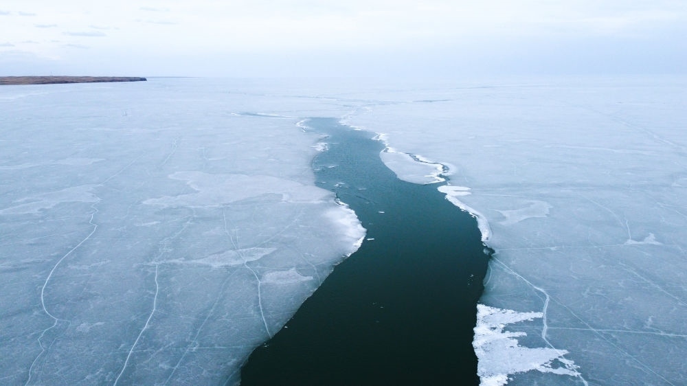 這是2023年4月17日拍攝的呼倫湖開湖景象(無人機(jī)照片)。新華社記者 王楷焱 攝
