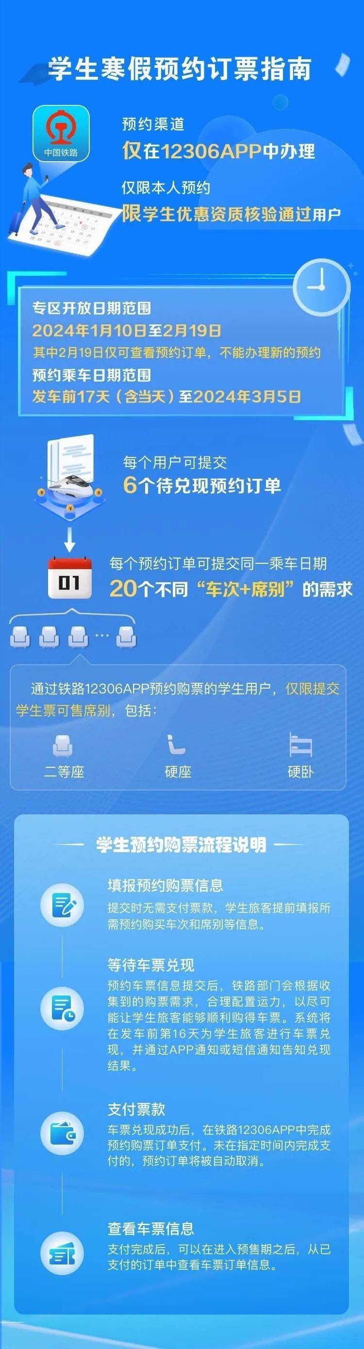 學(xué)生、務(wù)工人員通過鐵路12306專區(qū)購買春運(yùn)期間火車票,可提交開車前17天(含)以上的出行購票需求,最晚可預(yù)約3月5日的車票。符合條件的旅客朋友可在開車前17天23時(shí)前在12306手機(jī)客戶端提交購票需求,在開車前16天查詢兌現(xiàn)結(jié)果,須在開車前第16天23時(shí)前,通過12306手機(jī)客戶端預(yù)約專區(qū)支付票款,逾期未支付的,訂單自動取消;兌現(xiàn)成功后逾期未支付達(dá)到5次的,不再提供預(yù)約購票服務(wù)。