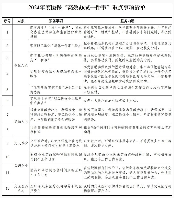為貫徹落實《國務院關于進一步優(yōu)化政務服務提升行政效能推動“高效辦成一件事”的指導意見》(國發(fā)〔2024〕3號,下文簡稱《指導意見》),精細化科學化常態(tài)化優(yōu)化醫(yī)保服務,提高群眾、企業(yè)和醫(yī)藥機構獲得感,國家醫(yī)療保障局今天(2月9日)發(fā)布關于在醫(yī)療保障服務領域推動“高效辦成一件事”的通知,著力提供更加便捷高效的醫(yī)療保障服務。