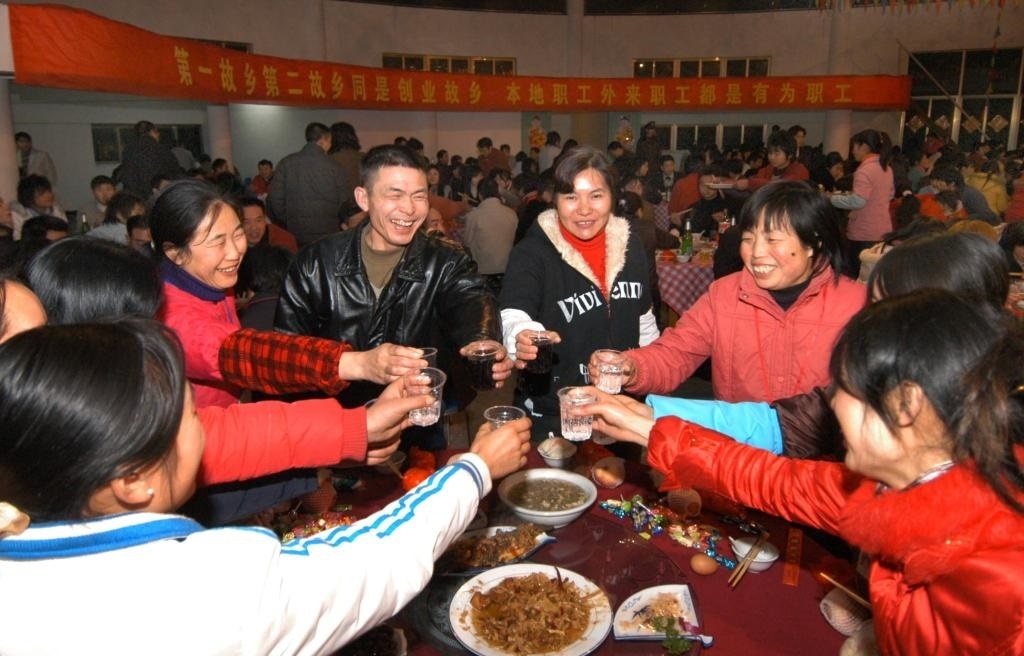 2011年2月2日,浙江諸暨一家公司準(zhǔn)備了豐盛的年夜飯,招待800多名沒(méi)有回家過(guò)年的員工及其家屬,歡聚一堂共迎新年。