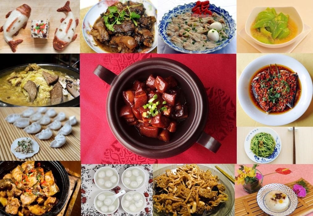 2014年拍攝的拼版照片:“一桌年夜飯”,依次為年糕、發(fā)菜豬手、扁肉燕、長(zhǎng)年菜、殺豬菜、餃子、紅燒肉、鴻運(yùn)當(dāng)頭、安豆苗、臭鱖魚(yú)、湯圓、四喜烤麩、八寶飯(從左至右、從上至下)。