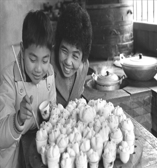 1980年,福建泉州歸僑陳素珍教她的小兒子在年糕上點(diǎn)紅。