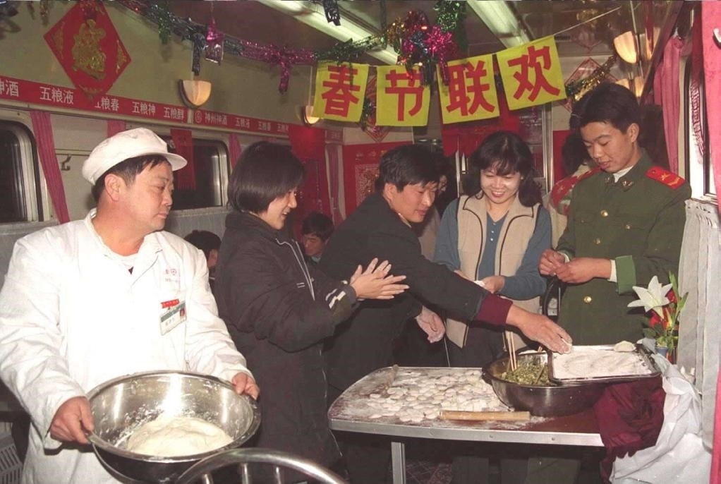 2000年2月5日,天津開(kāi)往廣州的一列列車上,工作人員為旅客準(zhǔn)備了熱氣騰騰的餃子,還精心編排了豐富多彩的文藝節(jié)目。
