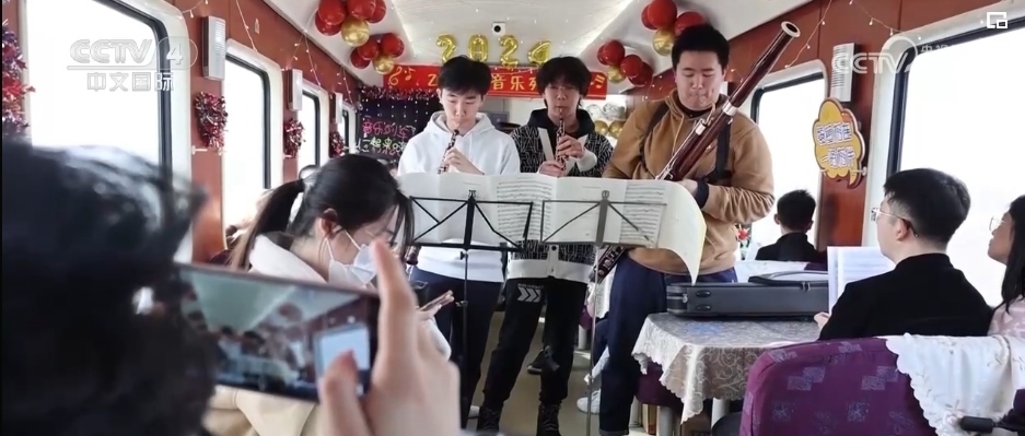 隨著春節(jié)臨近,在外務(wù)工的游子們紛紛踏上了回家的旅途。在青島北開(kāi)往成都西Z318次列車上,悅耳歡快旋律響起,列車工作人員邀請(qǐng)3位學(xué)生旅客,為大家演奏了悠揚(yáng)歡快的樂(lè)曲。