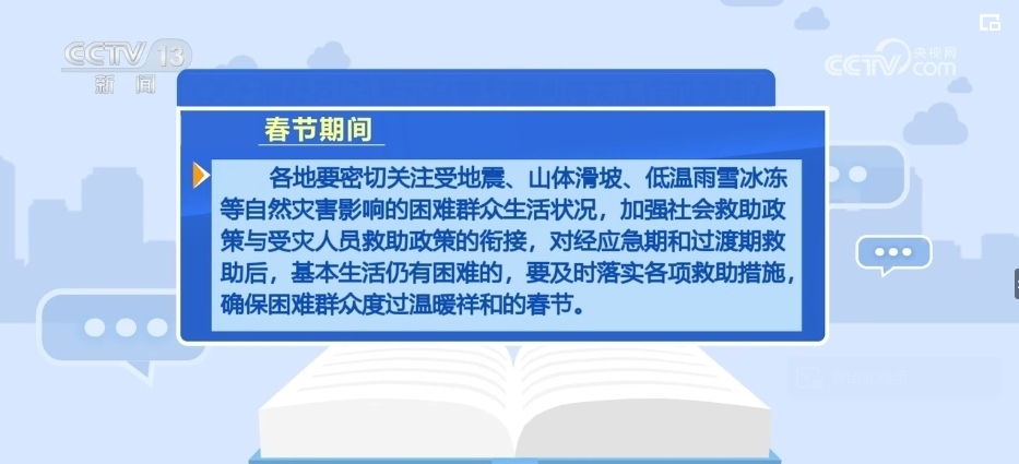 各地要密切關(guān)注受地震、山體滑坡、低溫雨雪冰凍等自然災(zāi)害影響的困難群眾生活狀況,加強(qiáng)社會救助政策與受災(zāi)人員救助政策的銜接,對經(jīng)應(yīng)急期和過渡期救助后,基本生活仍有困難的,要及時落實各項救助措施,確保困難群眾度過溫暖祥和的春節(jié)。