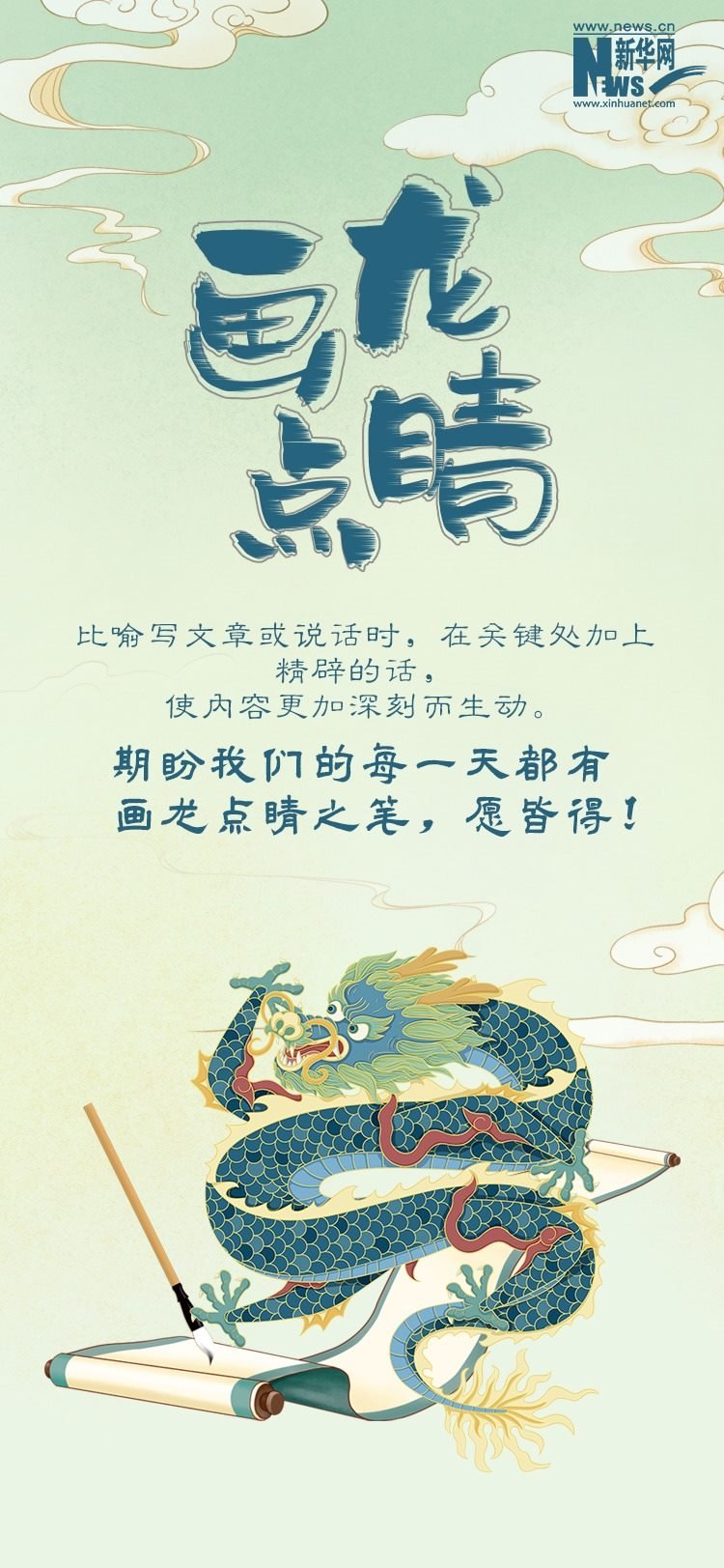 2024年是農(nóng)歷甲辰龍年。“龍”在中華民族心目中有著重要地位,被視為吉祥、權(quán)威和神圣的象征。在歷史發(fā)展長河中,“龍”逐步匯聚起豐富的文化內(nèi)涵與美好寓意,成為人們精神信仰和文化生活的重要組成部分。春節(jié)期間,《尋“龍”記》帶您領(lǐng)略博大精深的中華“龍”文化,本期推出一組寓意深遠、意蘊豐富的含有“龍”字的成語,為新的一年注入更多的美好祝愿。