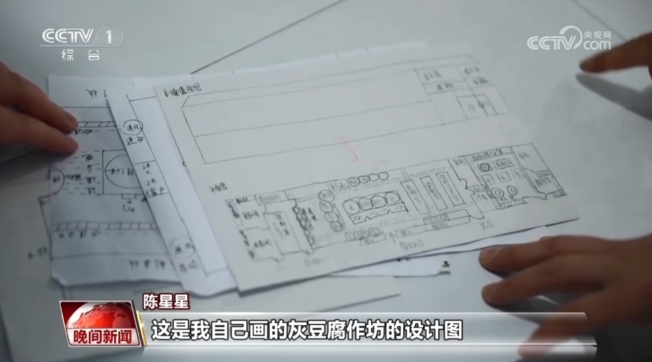 陳星星:這是我自己畫(huà)的灰豆腐作坊的設(shè)計(jì)圖。我們之前用傳統(tǒng)的在家里做的這種方式做出來(lái)的豆腐的話,一天最多可能就是一兩百斤的樣子,那么經(jīng)過(guò)我們這樣的一個(gè)改進(jìn)的話,一天可能能達(dá)到一兩千斤的產(chǎn)量。
