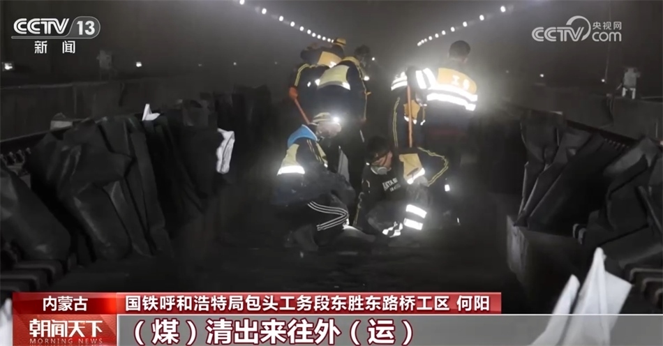 國鐵呼和浩特局包頭工務段東勝東路橋工區(qū) 何陽:這塊就已經(堆)積得相當厚了,咱們今天必須抓緊時間把這個清出來,煤清出來往外運,要不然后面影響貨車正常通行。