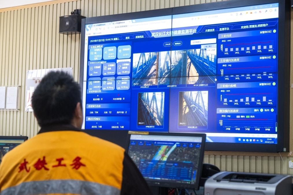 1月23日,武漢長(zhǎng)江大橋橋梁車(chē)間員工在主控室對(duì)武漢長(zhǎng)江大橋進(jìn)行監(jiān)測(cè)。新華社記者肖藝九 攝