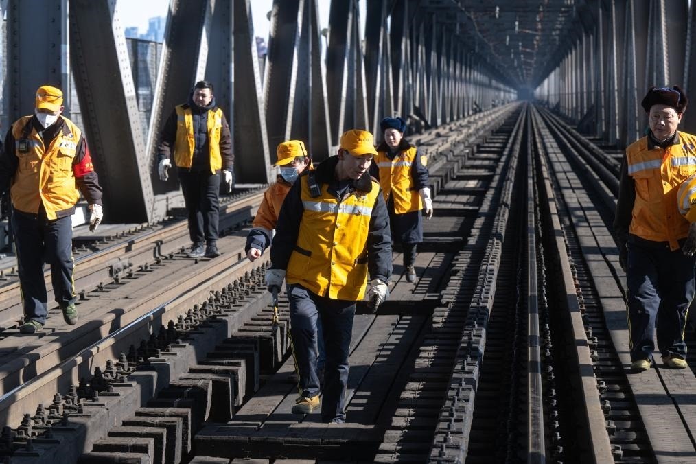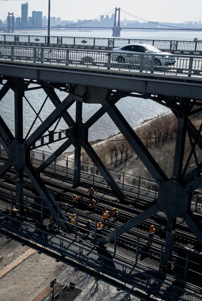 農(nóng)歷大年初三,湖北武漢陽(yáng)光明媚?!叭f(wàn)里長(zhǎng)江第一橋”——武漢長(zhǎng)江大橋宛若一條巨龍飛架于江水之上,氣勢(shì)恢宏。身穿工作服的陳卿明和同事,低頭、彎腰,循著大橋鐵道仔細(xì)地檢視鋼梁、枕木。