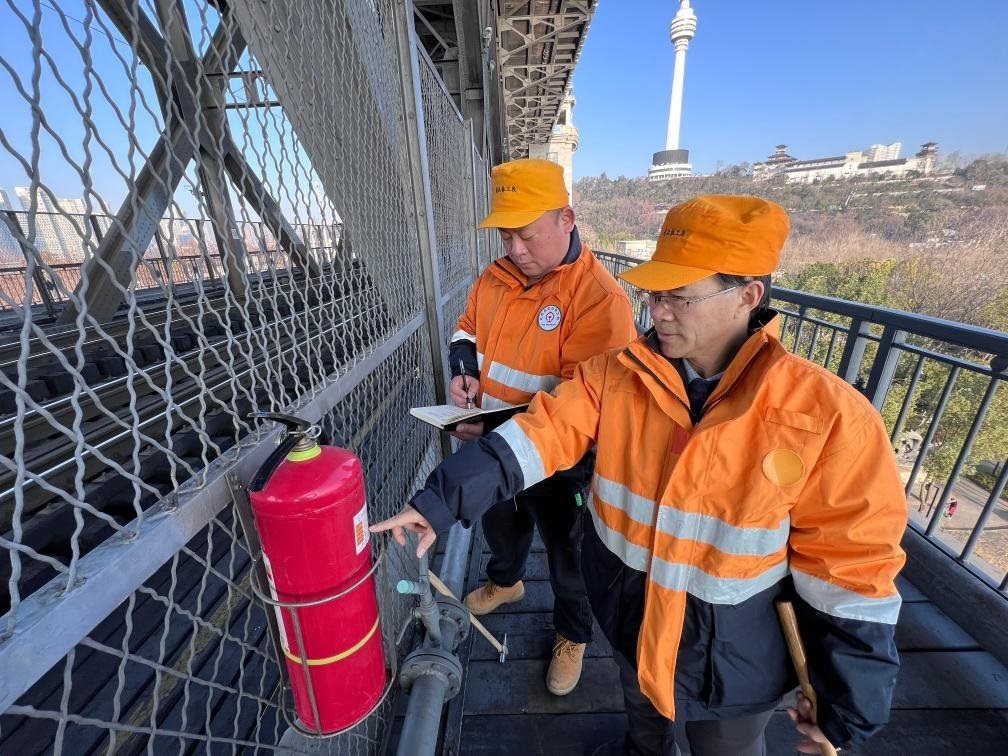 2月12日,武漢長(zhǎng)江大橋橋梁車(chē)間員工陳卿明(左)、趙福武在武漢長(zhǎng)江大橋上巡檢。(朱叢蓓 攝)