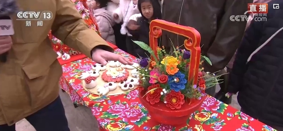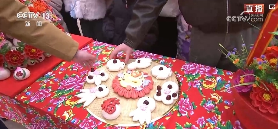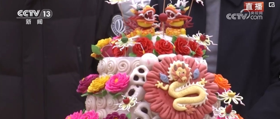 在春節(jié)期間,家家戶(hù)戶(hù)都會(huì)蒸年饃,每個(gè)年饃都有不同的寓意,花開(kāi)富貴、步步高升等,龍年特色的花饃非常熱銷(xiāo)。這個(gè)龍型年饃上彩色的元素都是可以食用的,黃色的身子是南瓜汁,藍(lán)色是當(dāng)?shù)匾环N茶葉水調(diào)出來(lái)的。