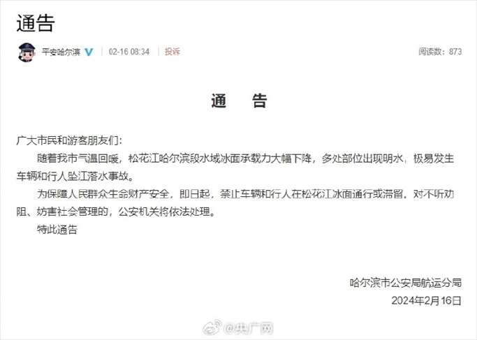 ·哈爾濱市公安局航運分局提醒:松花江冰面禁止車輛和行人通行。