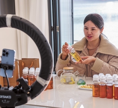 浙江省杭州市淳安縣一家民宿內(nèi),主播在進行“淳蜜共富”主題網(wǎng)絡(luò)直播。作為“高質(zhì)量發(fā)展建設(shè)共同富裕示范區(qū)”,浙江推出各種政策促進城鄉(xiāng)均衡發(fā)展。新華社記者 徐 昱攝