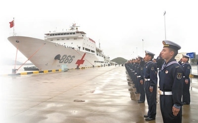 執(zhí)行“和諧使命—2022”任務(wù)的中國海軍“和平方舟”號醫(yī)院船返回浙江舟山某軍港,任務(wù)部隊官兵代表在碼頭迎接。“和平方舟”號醫(yī)院船是我國自主設(shè)計建造的首艘制式遠洋醫(yī)院船。自2008年入列以來,該船以“和諧使命”任務(wù)為主要載體,多次遠赴海外開展人道主義醫(yī)療服務(wù)。孫 飛攝(新華社發(fā))