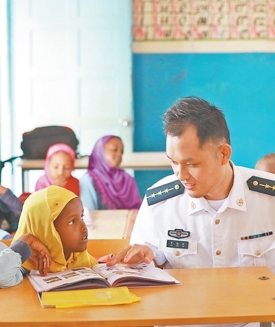 中國人民解放軍駐吉布提保障基地官兵與吉小學生交流。中國軍隊在吉布提建設(shè)保障基地,是中吉兩國政府經(jīng)過友好協(xié)商作出的決定,為中國軍隊執(zhí)行護航、維和任務(wù)等提供有力保障。30多年來,我國已派出維和人員5萬余人次,赴20多個國家和地區(qū)參加聯(lián)合國維和行動。王宗洋攝(影像中國)
