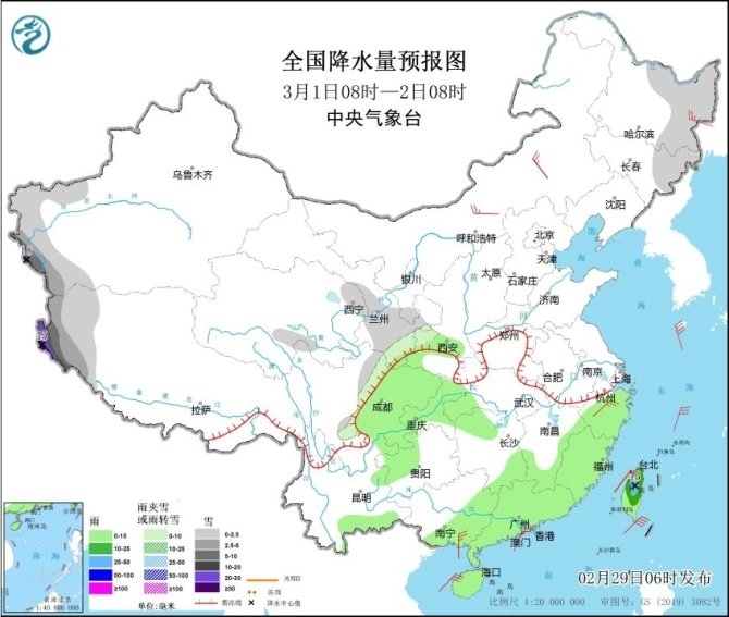 央視網(wǎng)消息:中央氣象臺網(wǎng)站2月29日消息,過去一天,全國雨雪逐漸發(fā)展增強,北方大部以降雪為主,集中在西北地區(qū)東部、內(nèi)蒙古、山西、山東和東北三省等地;南方地區(qū)雨水范圍明顯擴大,江蘇、上海、浙江、安徽南部、江西中北部、湖南中南部、廣西北部等地部分地區(qū)出現(xiàn)中到大雨,今天凌晨起,蘇皖北部出現(xiàn)雨轉雪,江蘇連云港、宿遷、徐州等地雪花紛飛,并伴隨低溫和大風天氣,體感十分寒冷。
