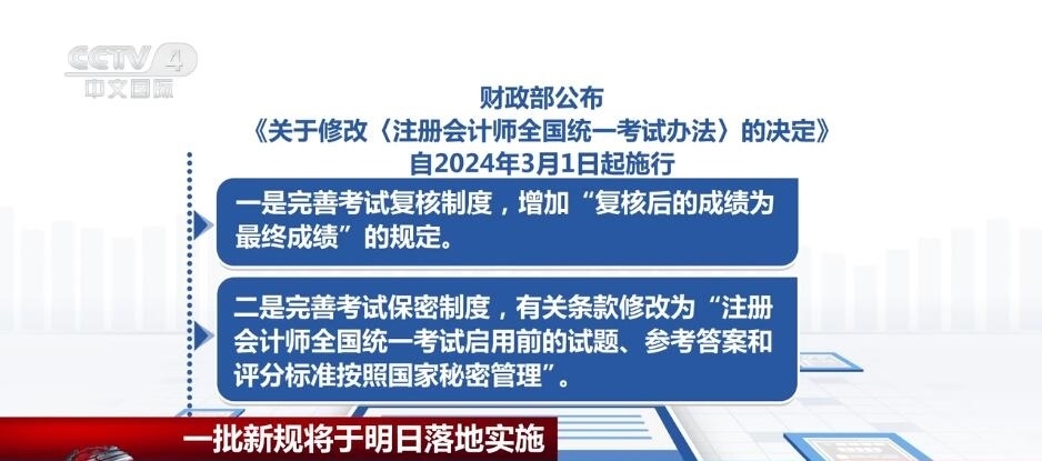 財(cái)政部公布《關(guān)于修改〈注冊(cè)會(huì)計(jì)師全國(guó)統(tǒng)一考試辦法〉的決定》,自2024年3月1日起施行?!稕Q定》共修改2條。一是完善考試復(fù)核制度,增加“復(fù)核后的成績(jī)?yōu)樽罱K成績(jī)”的規(guī)定。二是完善考試保密制度,有關(guān)條款修改為“注冊(cè)會(huì)計(jì)師全國(guó)統(tǒng)一考試啟用前的試題、參考答案和評(píng)分標(biāo)準(zhǔn)按照國(guó)家秘密管理”。
