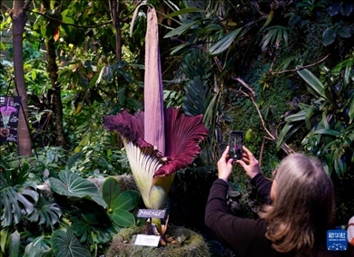 美國舊金山加州科學博物館內(nèi)一株開花的巨魔芋吸引大批游客觀賞。巨魔芋原產(chǎn)于印度尼西亞蘇門答臘島的熱帶雨林,每隔7至10年開花一次,每次開花時間只有24至36個小時。