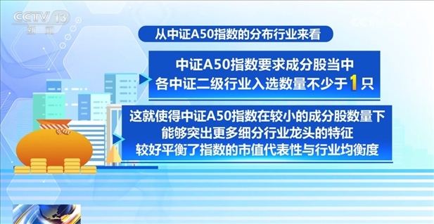 中證A50指數(shù)主要選取A股市值最大的50只證券作為指數(shù)樣本,同時對樣本公司的所屬行業(yè)有所要求,以反映A股核心上市公司證券的整體表現(xiàn),便利投資者“一鍵配置”各行業(yè)最具代表性的優(yōu)質龍頭企業(yè)。