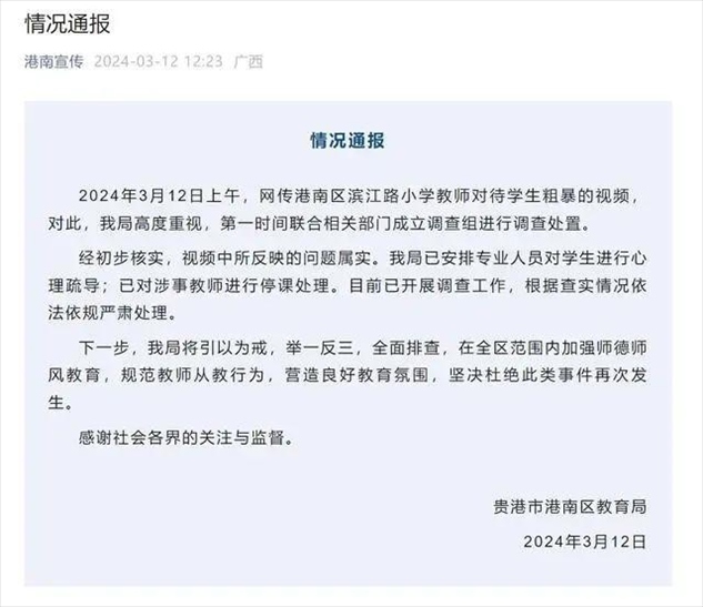 ·廣西通報(bào)“小學(xué)教師扇打拖拽學(xué)生”:屬實(shí),對涉事教師停課處理。