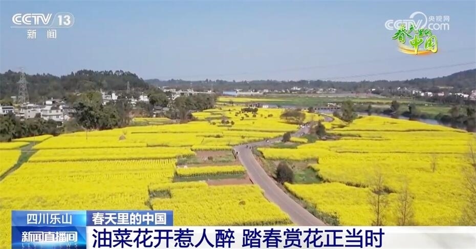 遠(yuǎn)眺峨眉山,近看峨眉河,萬(wàn)頃金波花如海,流金溢彩百里香?,F(xiàn)在我們看到的是四川樂(lè)山市中區(qū) 永和村的近千畝油菜花,在陽(yáng)光照射下,猶如斑斕的綢帶,妝點(diǎn)了峨眉河沿岸五彩的山色春光。趁著晴好天氣,市民、游客來(lái)到戶外踏青賞景,在花田中徜徉流連,感受春日美好時(shí)光。