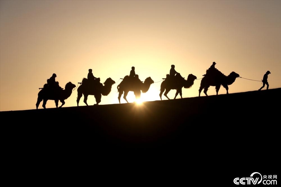 27日,甘肅敦煌,鳴沙山月牙泉景區(qū)晨光如畫,游客觀賞大漠日出,乘騎駱駝體驗絲路風情。