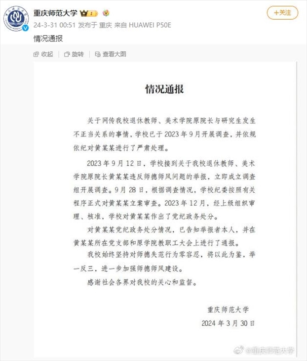 ·重慶師大通報(bào)“美院原院長(zhǎng)與學(xué)生有不正當(dāng)關(guān)系”:黨紀(jì)政務(wù)處分。