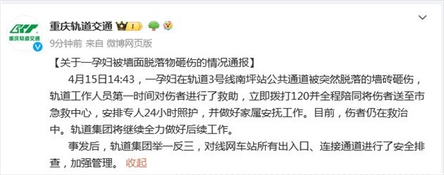 ·重慶軌交回應(yīng)“孕婦被墻面脫落物砸傷”:傷者仍在救治中。