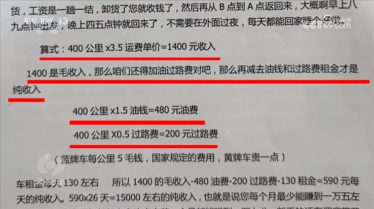 這些公司在和司機(jī)簽約時(shí),根據(jù)司機(jī)個(gè)人情況的不同,對(duì)他們收取幾千元到幾萬元不等的費(fèi)用。還沒掙錢就先交錢,而且交的還不少,司機(jī)們?yōu)槭裁磿?huì)心甘情愿地交這些錢呢?因?yàn)槊嬖嚂r(shí),公司給司機(jī)們?cè)敿?xì)算過他們的收入。