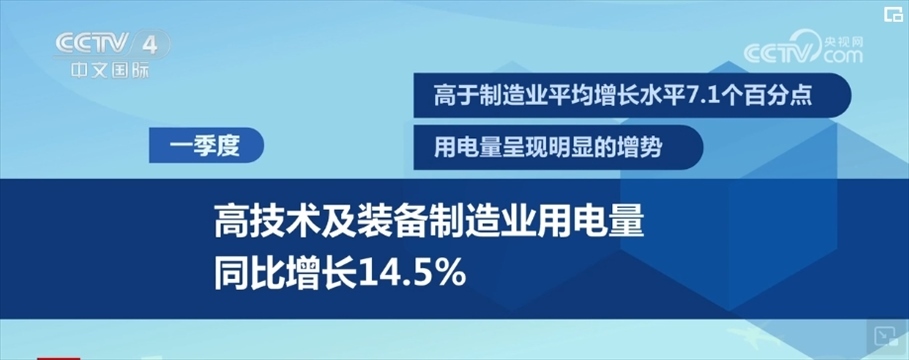 從行業(yè)看,一季度,高技術(shù)及裝備制造業(yè)用電量同比增長14.5%,高于制造業(yè)平均增長水平7.1個百分點,用電量呈現(xiàn)明顯的增勢。