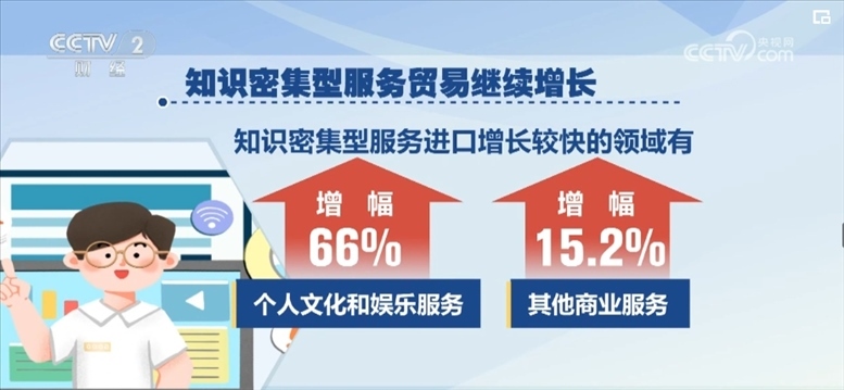 知識密集型服務(wù)貿(mào)易繼續(xù)增長。2024年一季度,知識密集型服務(wù)進出口7332.6億元,增長5.6%。其中知識密集型服務(wù)出口增長較快的領(lǐng)域有知識產(chǎn)權(quán)使用費、個人文化和娛樂服務(wù),增幅分別為34.4%、19%;知識密集型服務(wù)進口增長較快的領(lǐng)域有個人文化和娛樂服務(wù)、其他商業(yè)服務(wù),增幅分別為66%、15.2%。