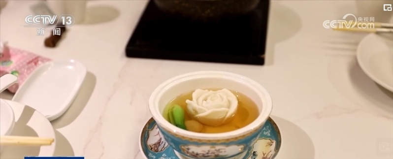 不僅僅是氛圍的打造,菜品創(chuàng)意也在還原原著中十二道菜品的基礎(chǔ)上,再對(duì)其進(jìn)行創(chuàng)新和延伸, “可卿山藥棗泥糕”“鳳姐火腿肘子”“寶釵胭脂鵝”等獨(dú)具紅樓特色的菜品,都可以在這里吃到。這朵以假亂真的花朵是這里的一道招牌菜,由魚(yú)茸制作而成的“黛玉傳花”,來(lái)自上海的房阿姨對(duì)這道菜尤為喜愛(ài)。