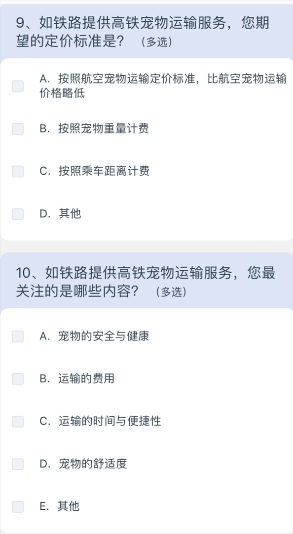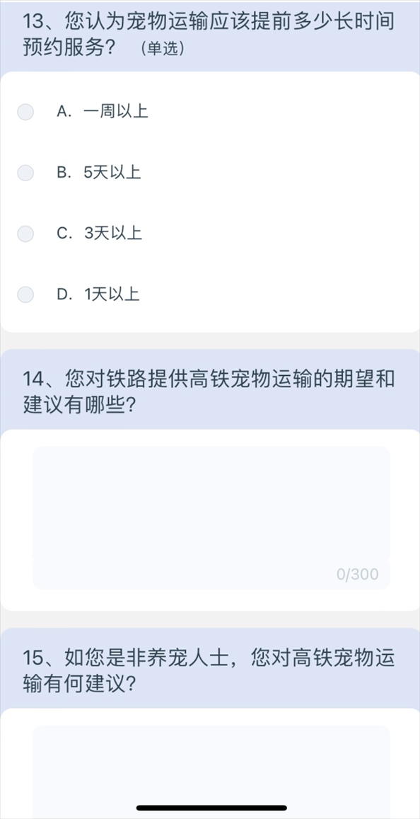 5月10日上午8點40分,澎湃新聞記者通過掃描網(wǎng)友分享的列車上的二維碼,進入12306系統(tǒng),選擇問卷·建議,進入“鐵路旅客高鐵寵物運輸”調(diào)查,共15個問題,涉及養(yǎng)寵類型、是否有攜帶寵物出行的需求、如果鐵路提供寵物運輸服務(wù)是否愿意嘗試等,以及為降低對其他旅客的影響,在高鐵寵物運輸更關(guān)注哪方面的防護;如鐵路提供高鐵寵物運輸服務(wù),期望的定價標準;如鐵路提供高鐵寵物運輸服務(wù),最關(guān)注的內(nèi)容;如果是非養(yǎng)寵人士,對高鐵寵物運輸有何建議等多方面問題。