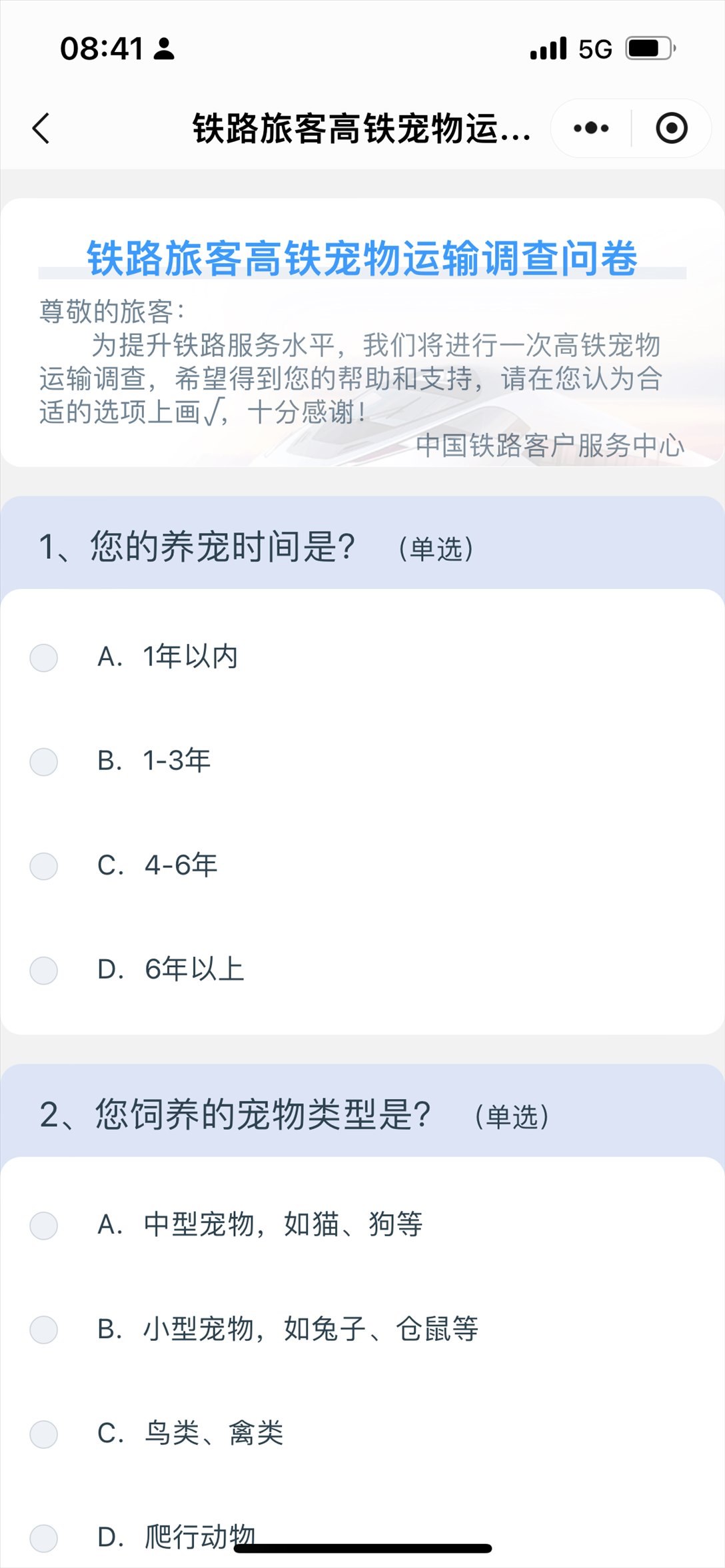 中國鐵路客戶服務(wù)中心推出高鐵寵物運輸調(diào)查問卷。 截屏圖