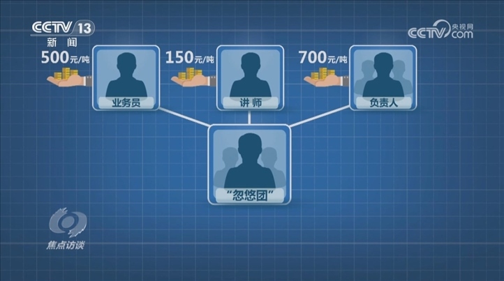 氯化銨和硫酸銨都屬于氮肥的生產(chǎn)原料,成本價(jià)約為800—900元/噸。據(jù)專案組調(diào)查,幾個(gè)代工廠將原料簡(jiǎn)單攪拌裝袋后,賣給定制化肥的總經(jīng)銷商張某華,價(jià)格就變成1100—1200元/噸,中間差價(jià)約300元/噸;總經(jīng)銷商張某華把化肥交付給代理商張某昌,價(jià)格為1375元/噸,差價(jià)約200元/噸;張某昌轉(zhuǎn)賣給實(shí)體“忽悠團(tuán)”的價(jià)格為1900元/噸,中間差價(jià)約500元/噸;“忽悠團(tuán)”賣給農(nóng)戶的最終價(jià)格為3250元/噸,其中:業(yè)務(wù)員每噸抽成500元,講師每噸抽成150元,“忽悠團(tuán)”幾位負(fù)責(zé)人每噸獲利700元。就這樣,每噸成本不到1000元的氮肥,披著復(fù)合肥的外衣,在農(nóng)戶手里翻了三倍多。