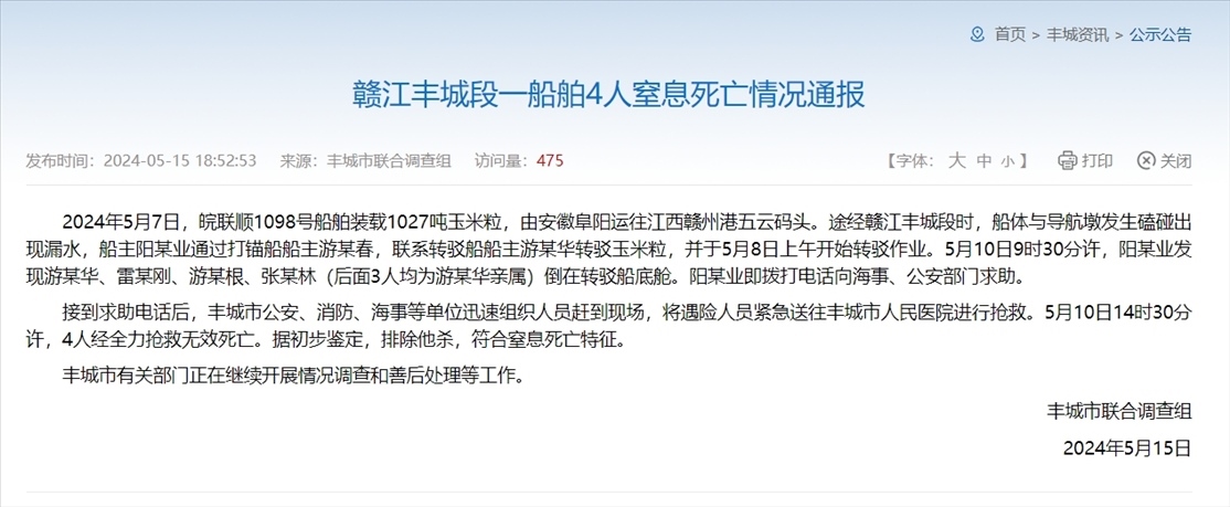 ·江西豐城4人轉(zhuǎn)運(yùn)受潮玉米時身亡,官方通報(bào):因窒息死亡,排除他殺。