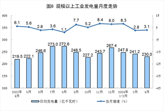 電力生產(chǎn)增速有所加快。4月份,規(guī)上工業(yè)發(fā)電量6901億千瓦時(shí),同比增長(zhǎng)3.1%,增速比3月份加快0.3個(gè)百分點(diǎn);日均發(fā)電230.0億千瓦時(shí)。1—4月份,規(guī)上工業(yè)發(fā)電量29329億千瓦時(shí),同比增長(zhǎng)6.1%。
