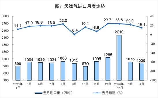 1—4月份,規(guī)上工業(yè)天然氣產(chǎn)量830億立方米,同比增長(zhǎng)5.0%。進(jìn)口天然氣4300萬噸,同比增長(zhǎng)20.7%。