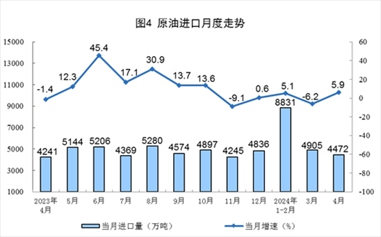 原油生產(chǎn)平穩(wěn)增長(zhǎng),進(jìn)口由降轉(zhuǎn)增。4月份,規(guī)上工業(yè)原油產(chǎn)量1747萬噸,同比增長(zhǎng)1.3%,增速比3月份加快0.1個(gè)百分點(diǎn);日均產(chǎn)量58.2萬噸。進(jìn)口原油4472萬噸,同比增長(zhǎng)5.9%。