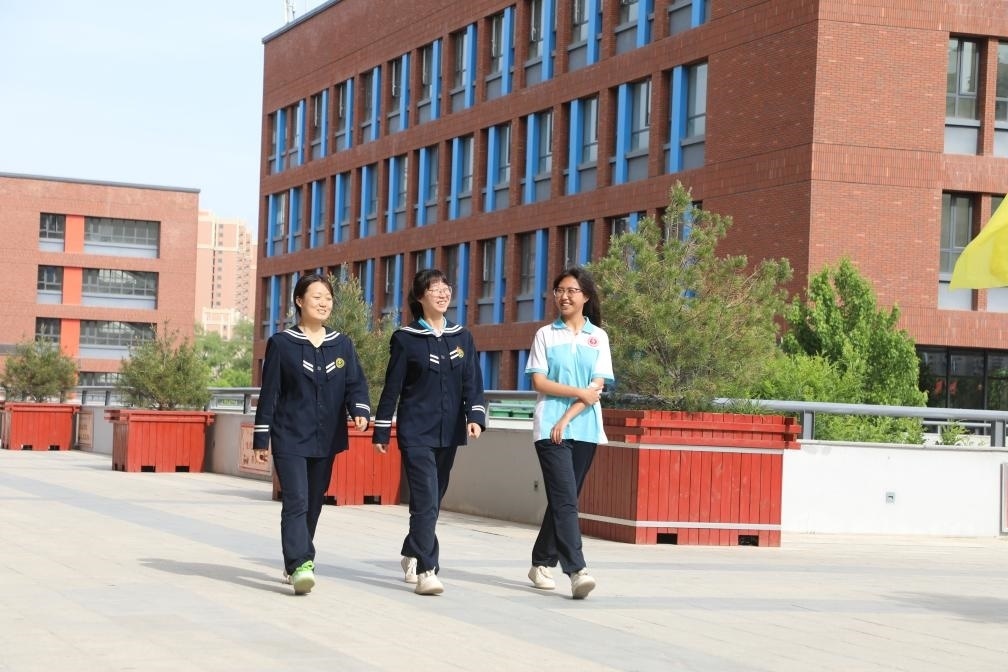 郭嘉齡(左一)和同學(xué)一起在平?jīng)鍪械谝恢袑W(xué)的校園里散步。新華社記者 張智敏 攝