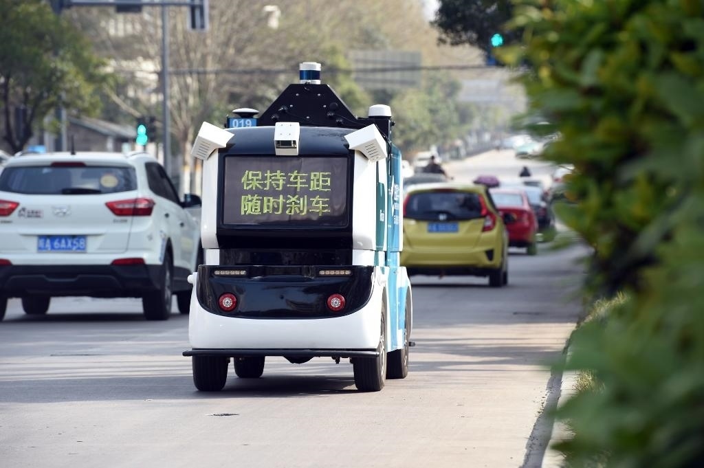 資料圖片:2022年3月15日,一輛無人配送車在合肥高新區(qū)進(jìn)行公開道路測試。新華社記者 周牧 攝