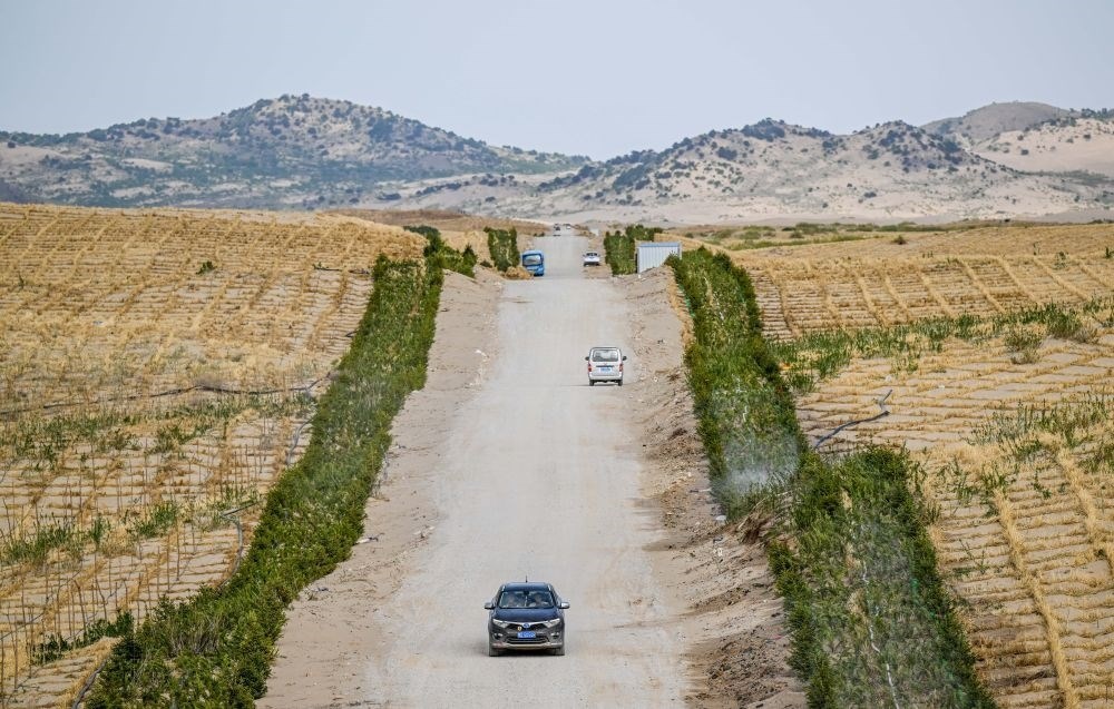 ?在內(nèi)蒙古赤峰市翁牛特旗巴彥呼交嘎查其白線防沙治沙項(xiàng)目區(qū),穿沙公路將沙地切割,沙丘被逐步固定(2024年5月16日攝,無人機(jī)照片)。新華社記者 連振 攝