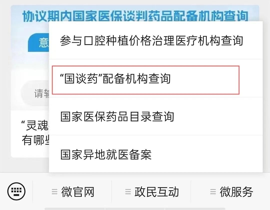 第一步:進入“國家醫(yī)保局”微信公眾號,點擊微服務(wù)→“國談藥”配備機構(gòu)查詢,進入查詢頁面。