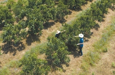 曹立新(右)在柑橘基地里給農(nóng)民做技術(shù)指導。鄭家裕攝