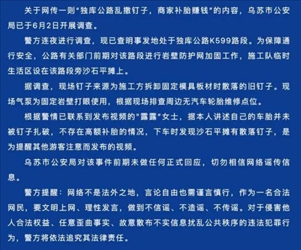 ·新疆烏蘇警方通報“獨庫公路亂撒釘子”:系施工方拆卸板材時散落,現(xiàn)場排查周邊無汽車輪胎維修點。